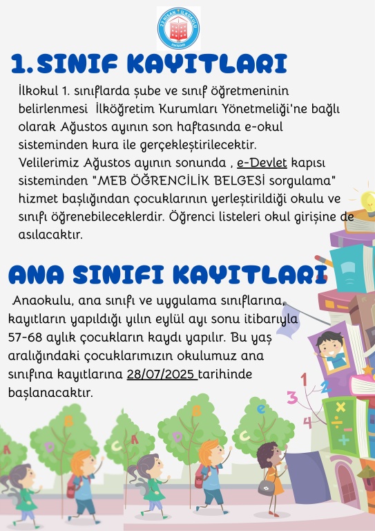 2025-2026 Eğitim Öğretim Yılı için, okulumuzun 1. sınıflarına öğrenci kayıtları; çocuklarımızın MERNİS bilgileri esas alınarak, herhangi bir başvuru olmaksızın, Bakanlığımız tarafından e-Okul Yönetim Bilgi Sistemi üzerinden yapılacaktır.
