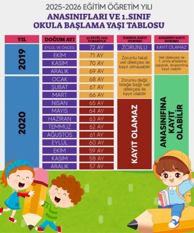 Ana sınıflarına, kayıtların yapıldığı yılın eylül ayı sonu itibarıyla 57-68 aylık çocukların kaydı yapılır.( 2019 Ekim-Kasım-Aralık ve 2020 doğumlular)